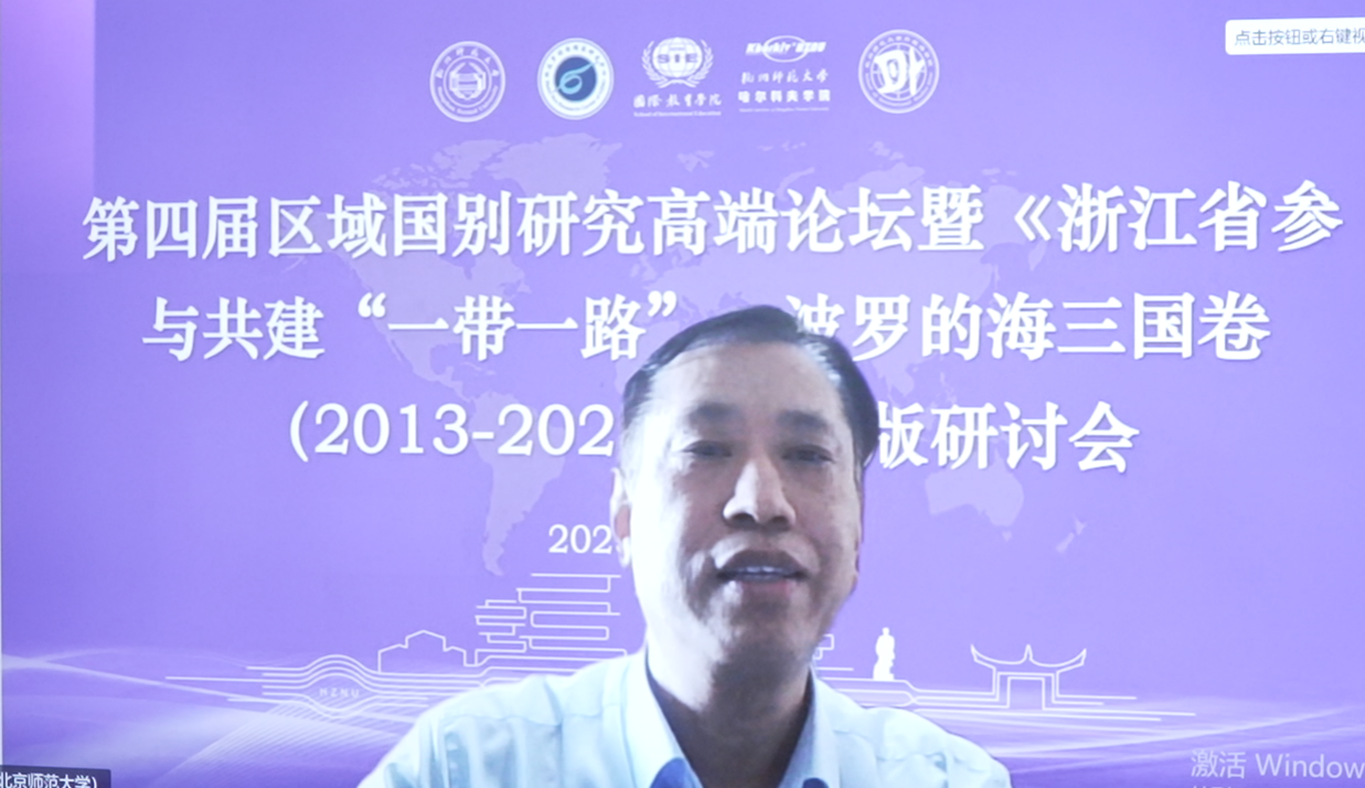 教育部国别和区域研究工作秘书处主任罗林教授线上致辞。他回顾了自己见证杭师大环波中心成立与发展的历程,指出全国波罗的海国家相关研究仍有不足,肯定了杭师大环波中心在跨学科整合、学术交流、咨政服务等方面的成果及工作成效,热烈祝贺《浙江省参与共建“一带一路”:波罗的海三国卷(2013-2023)》的出版并期待后续著作问世,同时祝愿波罗的海区域国别研究蓬勃发展、环波中心发展更上一层楼。